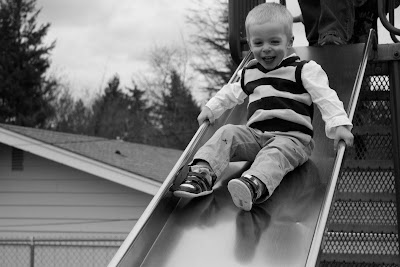 Fear of the unknown lurks within all of us.  There is a really tall slide at a park near our house.  Jack is obsessed with it.  I've always climbed the stairs behind him, made him wait at the top while I adjusted myself, put him on my lap and slid down with him.